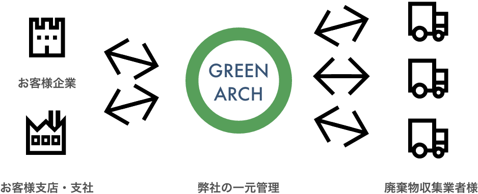 お客様の環境への取り組み対応(サポート)し、環境ビジネスをトータルに提供。廃棄物に関するグリーンアーチの知識と経験に基づき、お客様一人一人に適用する環境マネジメントを提案し運営させていただきます。